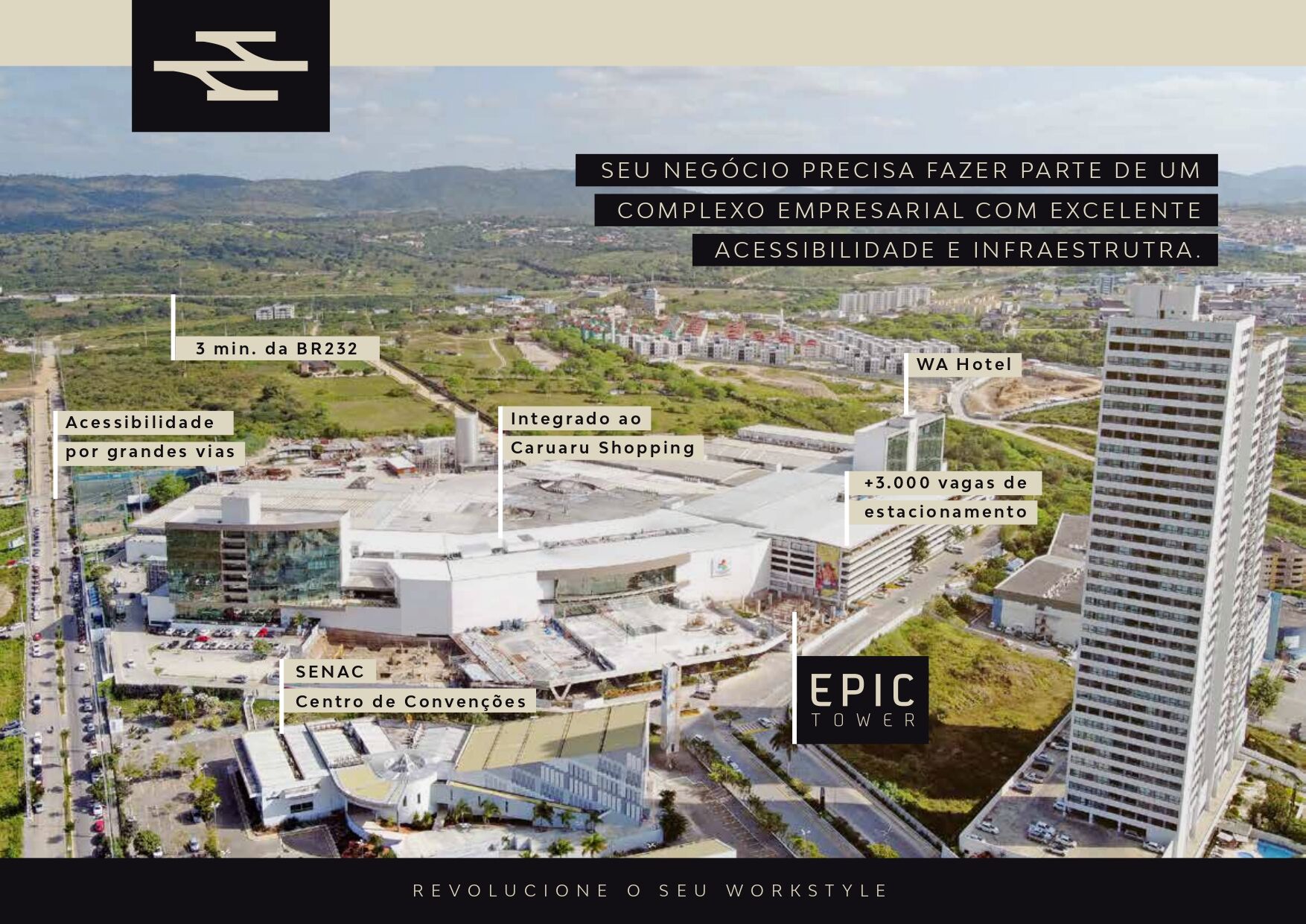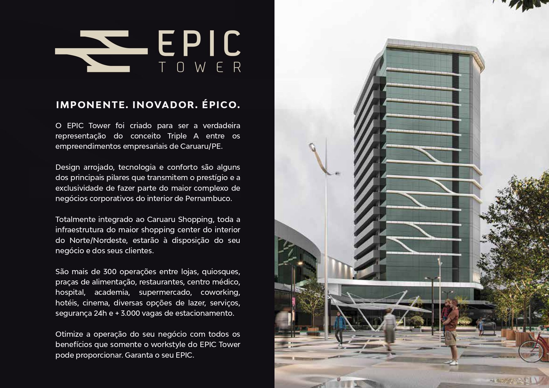O EPIC Tower foi criado com design arrojado, tecnologia e conforto, esses são alguns dos principais pilares que transmitem o prestígio e a exclusividade de fazer parte do maior complexo de negócios corporativos do interior de Pernambuco. Totalmente integrado ao Caruaru Shopping, você adquire a vantagem de ter toda a infraestrutura do maior shopping center do interior do Norte/Nordeste à disposição do seu negócio.
